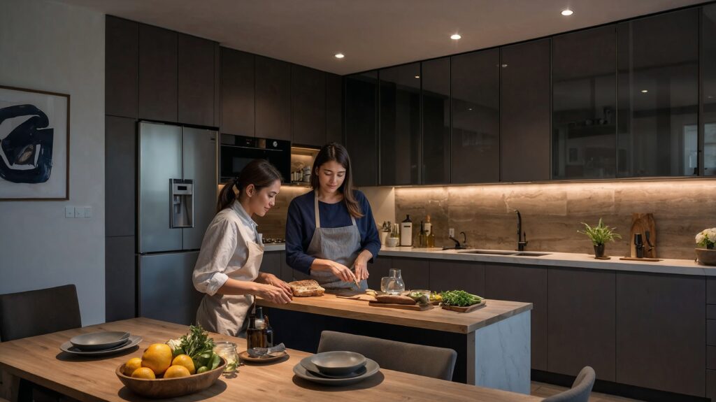 - Konyhai hangulatvilágítás: Este, amikor vacsorát készítesz, a munkafelület fénye automatikusan felkapcsolódik, miközben a háttérvilágítás kellemes atmoszférát teremt.